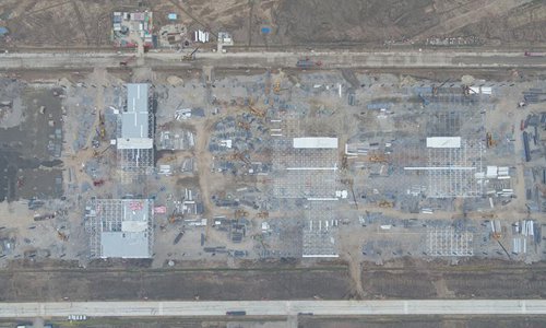 Aerial photo taken on April 3, 2019 shows the construction site of Tesla's new gigafactory in Shanghai, east China. (Xinhua/Ding Ting)
