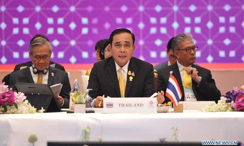 Thai Prime Minister Prayut Chan-o-cha attends the 34th Association of Southeast Asian Nations (ASEAN) summit plenary session in Bangkok, Thailand, June 22, 2019. The 34th ASEAN Summit, which is chaired by Thailand and will last until Sunday, will discuss the affairs of the 10 member countries, the current status of the ASEAN community and its future tasks. (Xinhua/Rachen Sageamsak)