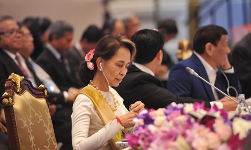 Myanmar's State Counselor Aung San Suu Kyi attends the 34th Association of Southeast Asian Nations (ASEAN) summit plenary session in Bangkok, Thailand, June 22, 2019. The 34th ASEAN Summit, which is chaired by Thailand and will last until Sunday, will discuss the affairs of the 10 member countries, the current status of the ASEAN community and its future tasks. (Xinhua/Rachen Sageamsak)
