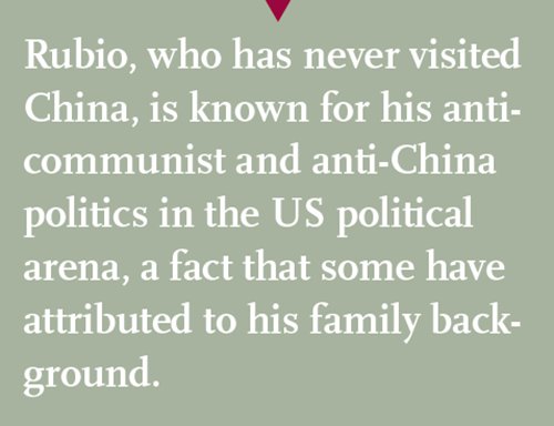 However, since his tenure as senator, Rubio's proposals and remarks against China have surged. Analysts have said this has something to do with both his personal background and the trend of US politics in recent years.