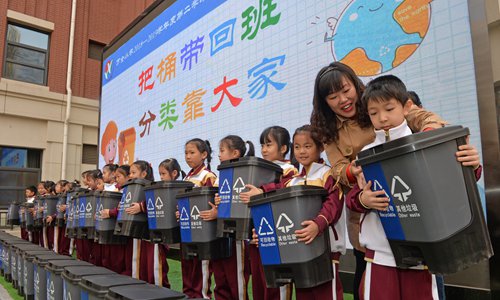 Students in North China's Tianjin Municipality participate in an event for promoting waste sorting in April. Photo: VCG