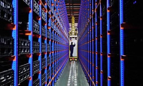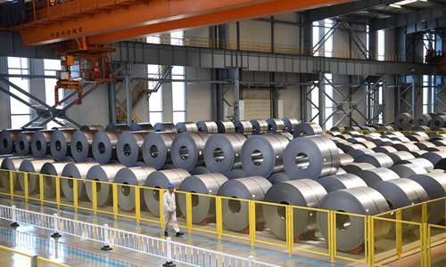 A worker of HBIS Group Tangsteel Company patrols at the steel coil storage area in Tangshan, north China's Hebei Province, May 31, 2019. (Xinhua/Mu Yu)