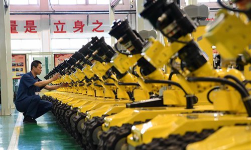 A technician checks fire-fighting robots at a robot company in Tangshan City, north China's Hebei Province, June 11, 2019. (Xinhua/Mu Yu)