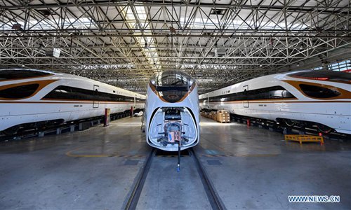 Photo taken on May 31, 2019 shows the production line of bullet train of CRRC Tangshan Co. Ltd. in Tangshan City, north China's Hebei Province. (Xinhua/Mu Yu)