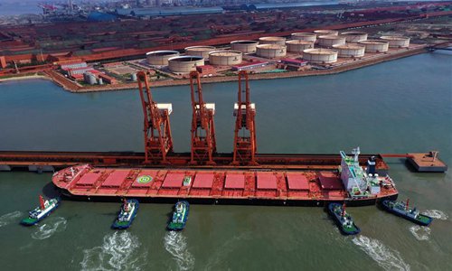 Aerial photo taken on June 11, 2019 shows ships docking at ore wharf of Caofeidian Port in Tangshan, north China's Hebei Province. (Xinhua/Mu Yu)