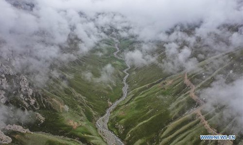 Aerial photo taken on June 22, 2019 shows a scenery of the Laybulak pasture in Taxkorgan Tajik Autonomous County of northwest China's Xinjiang Uygur Autonomous Region. The Laybulak pasture lies in the heartland of the Pamir Plateau in northwest China at around 3,700 meters above sea level. Its bountiful water resources and forage grasses make it an ideal summer pasture for the nomads nearby. (Xinhua/Hu Huhu)