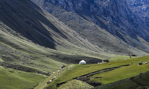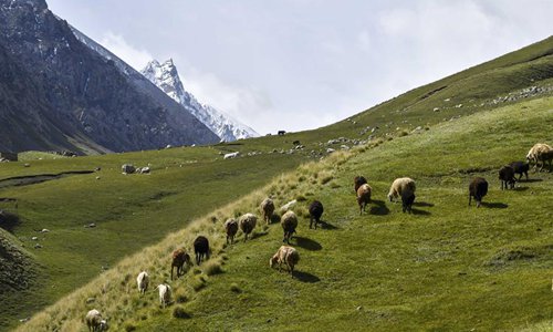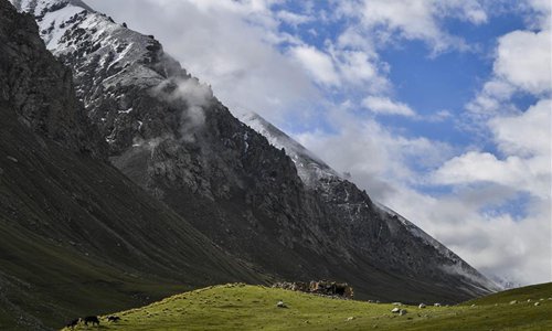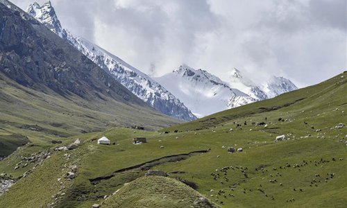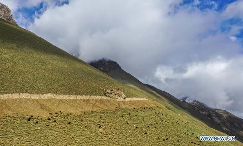 A herd of livestock graze on the Laybulak pasture in Taxkorgan Tajik Autonomous County of northwest China's Xinjiang Uygur Autonomous Region, June 22, 2019. The Laybulak pasture lies in the heartland of the Pamir Plateau in northwest China at around 3,700 meters above sea level. Its bountiful water resources and forage grasses make it an ideal summer pasture for the nomads nearby. (Xinhua/Hu Huhu)