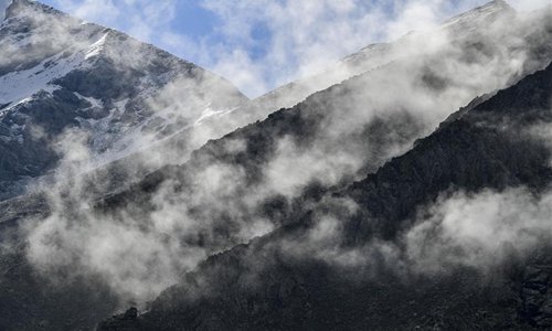 Photo taken on June 22, 2019 shows mountains of the Laybulak pasture amid clouds in Taxkorgan Tajik Autonomous County of northwest China's Xinjiang Uygur Autonomous Region. The Laybulak pasture lies in the heartland of the Pamir Plateau in northwest China at around 3,700 meters above sea level. Its bountiful water resources and forage grasses make it an ideal summer pasture for the nomads nearby. (Xinhua/Hu Huhu)