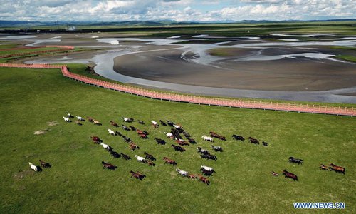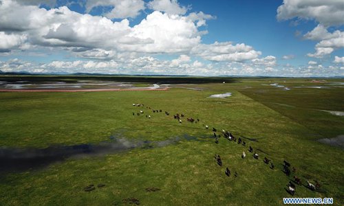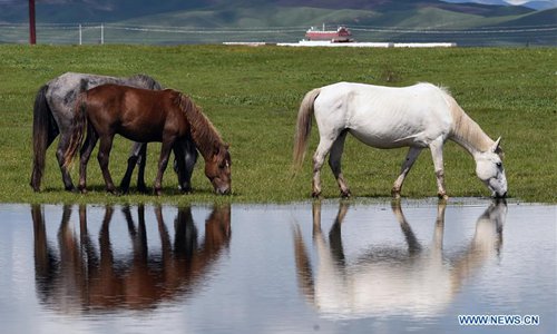 Hequ horses search for food at a wetland of the Hequ horse ranch in Maqu County of Gannan Tibetan Autonomous Prefecture, northwest China's Gansu Province, June 22, 2019. Maqu County is the main home to Hequ horses, a famous horse breed in China. (Xinhua/Ma Ning)