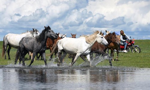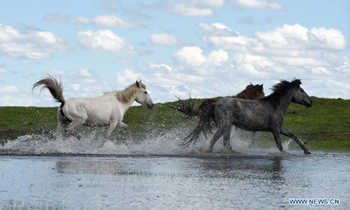 Hequ horses run at a wetland of the Hequ horse ranch in Maqu County of Gannan Tibetan Autonomous Prefecture, northwest China's Gansu Province, June 22, 2019. Maqu County is the main home to Hequ horses, a famous horse breed in China. (Xinhua/Ma Ning)
