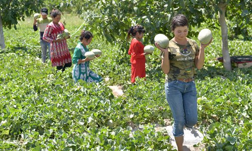 Farmers carry harvested honeydew melons in Bachu County of northwest China's Xinjiang Uygur Autonomous Region, June 23, 2019. Located on the western edge of the Taklimakan Desert, Bachu County features sandy soil and a big temperature difference between day and night with its frost-free period lasting over 200 days a year, which are very favorable for honeydew melons' growth. So far, the planting area of honeydew melons in Bachu totaled 10,000 mu (about 666.67 hectares), and the total output value is expected to exceed 35 million yuan (about 5.11 million U.S. dollars). (Xinhua/Ding Lei)