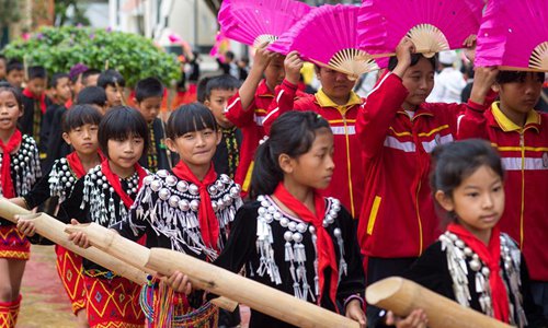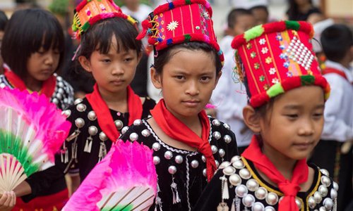 Girls dressed up in traditional dress prepare to practice Munao Dancing at Yingpan Ethnic Primary School in Xishan Township of Mangshi City, Dehong Dai and Jingpo Autonomous Prefecture, southwest China's Yunnan Province, June 21, 2019. Munao Dancing is a traditional folk dance of Jingpo ethnic group which was enlisted as national intangible cultural heritage in 2006. Performers dance in two long lines to drums and gongs with swords and crossbows in hands. Yingpan Ethnic Primary School has been teaching the dance to pupils since 2014 to promote this tradition. (Xinhua/Hu Chao)