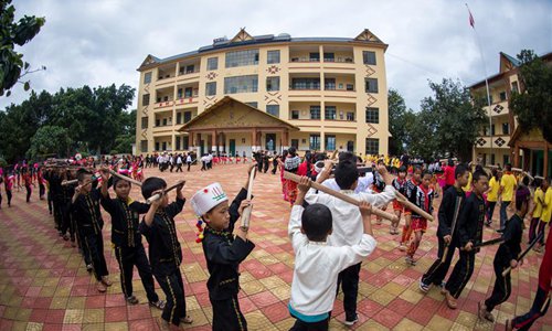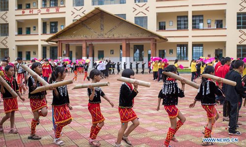 Pupils of Yingpan Ethnic Primary School practices Munao Dancing during a break in Xishan Township of Mangshi City, Dehong Dai and Jingpo Autonomous Prefecture, southwest China's Yunnan Province, June 21, 2019. Munao Dancing is a traditional folk dance of Jingpo ethnic group which was enlisted as national intangible cultural heritage in 2006. Performers dance in two long lines to drums and gongs with swords and crossbows in hands. Yingpan Ethnic Primary School has been teaching the dance to pupils since 2014 to promote this tradition. (Xinhua/Hu Chao)