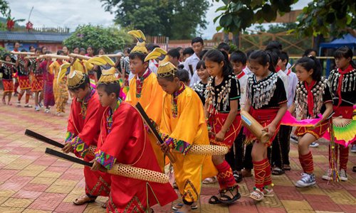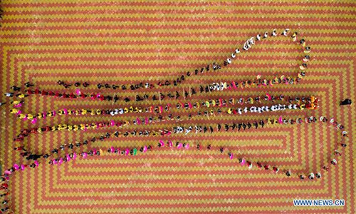Pupils of Yingpan Ethnic Primary School practices Munao Dancing in Xishan Township of Mangshi City, Dehong Dai and Jingpo Autonomous Prefecture, southwest China's Yunnan Province, June 21, 2019. Munao Dancing is a traditional folk dance of Jingpo ethnic group which was enlisted as national intangible cultural heritage in 2006. Performers dance in two long lines to drums and gongs with swords and crossbows in hands. Yingpan Ethnic Primary School has been teaching the dance to pupils since 2014 to promote this tradition. (Xinhua/Hu Chao)