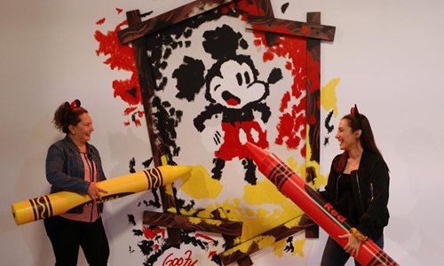 Visitors pose for photos at the Pop-Up Disney! A Mickey Celebration at Disneyland Resort in Anaheim, California, the United States, June 20, 2019. The exhibition featuring Mickey and Minnie-themed rooms celebrates 90 years of Mickey Mouse. (Xinhua/Li Ying)