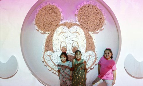 Children pose for photos at the Pop-Up Disney! A Mickey Celebration at Disneyland Resort in Anaheim, California, the United States, June 20, 2019. The exhibition featuring Mickey and Minnie-themed rooms celebrates 90 years of Mickey Mouse. (Xinhua/Li Ying)