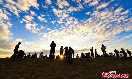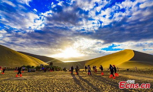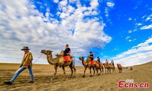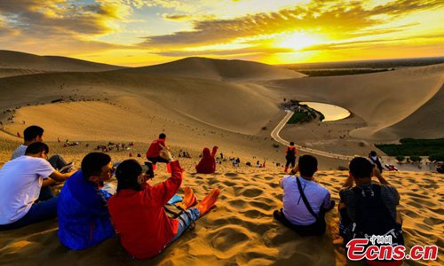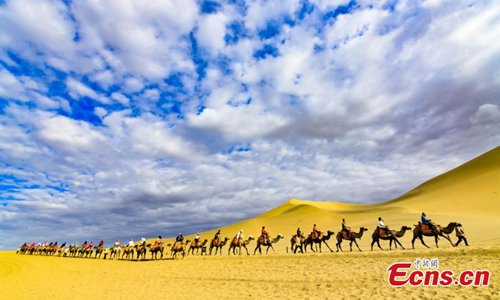 Tourists visit Crescent Spring and Mingsha Mountain scenic spot in the Gobi desert in Dunhuang City, Northwest China's Gansu Province in the second half of June. With of a vast expanse of sand dunes, Mingsha Mountain, or "Singing Sand," is famous for its desert scenery and the mysterious sound made by wind blowing over its surface. The area’s blue sky, white clouds and rolling sands are particularly appealing to tourists. (Photo: China News Service/Wang Binyin)