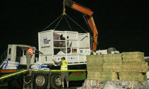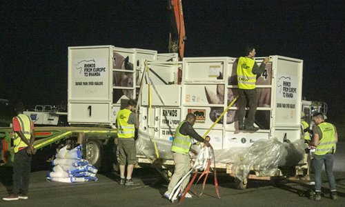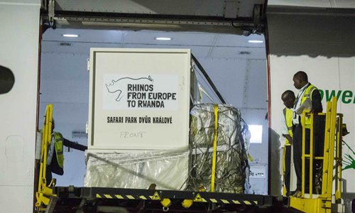A crate with a rhino inside is offloaded from an aircraft at Kigali International Airport in Kigali, capital city of Rwanda, on June 24, 2019. Five critically endangered black rhinos from Europe safely landed in the Rwandan capital, Kigali, early Monday. The rhinos will be released into Akagera National Park, in eastern Rwanda, Rwanda Development Board (RDB) said on a Twitter post. (Xinhua/Cyril Ndegeya)