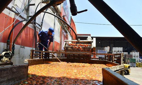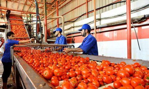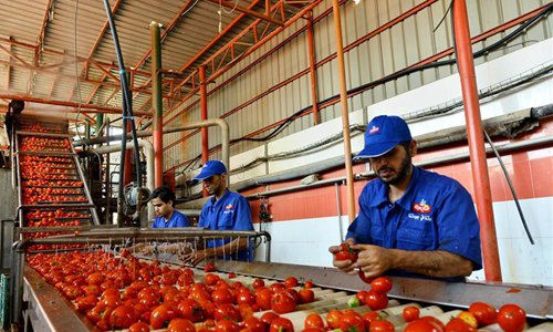 Palestinian employees work at a tomato paste factory at the Jabalia refugee camp in the northern Gaza Strip, June 24, 2019. (Xinhua/Stringer)