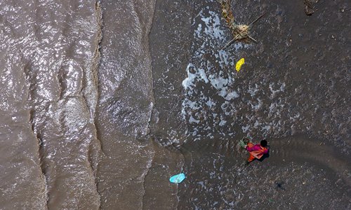 A local fisherman picks up trash at a beach in North China's Tianjin Municipality on March 24. Photo: IC