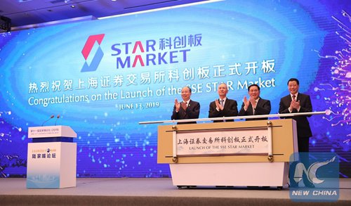 Honored guests preside over the launching ceremony of the sci-tech innovation board of the Shanghai Stock Exchange at the Lujiazui Forum in Shanghai, east China, June 13, 2019. (Photo: Xinhua)