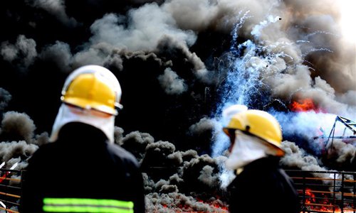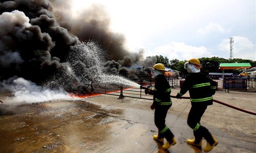 Fire fighters spray water onto burning seized drugs during a drug destruction ceremony marking the International Day against Drug Abuse and Illicit Trafficking in Yangon, Myanmar, June 26, 2019.(Photo: Xinhua)