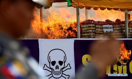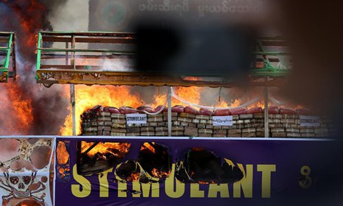 Seized drugs are set on fire during a drug destruction ceremony marking the International Day against Drug Abuse and Illicit Trafficking in Yangon, Myanmar, June 26, 2019.(Photo: Xinhua)