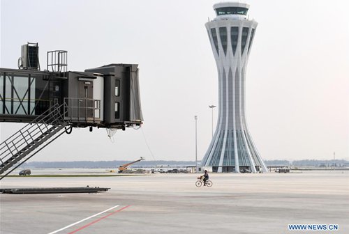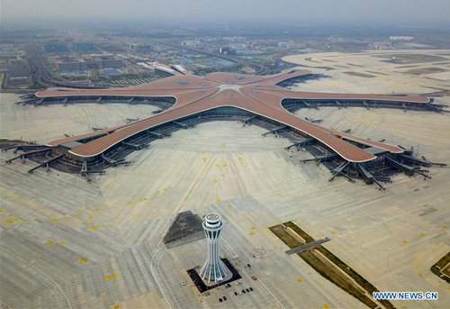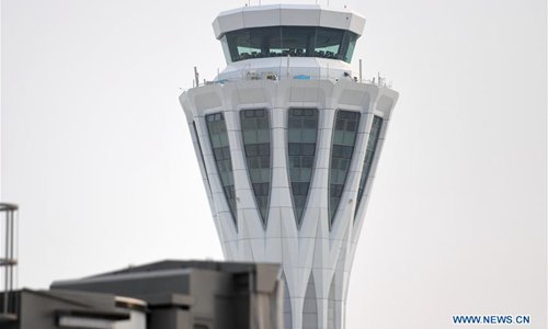 Aerial photo taken on June 25, 2019 shows the west control tower of the newly-built Daxing International Airport in Beijing, capital of China. The west control tower of Daxing International Airport was put into use on Tuesday. This control tower will manage over 70 percent of the airport's takeoffs and landings. (Photo: Xinhua)