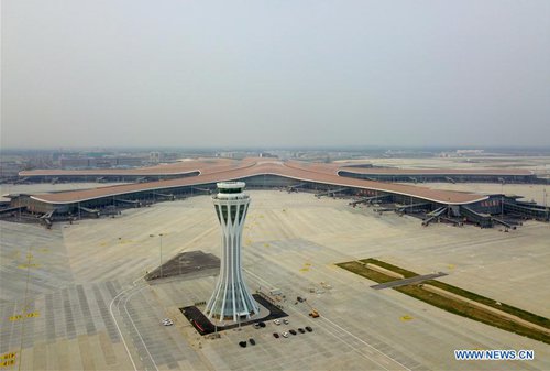 Aerial photo taken on June 25, 2019 shows the west control tower and the terminal building of the newly-built Daxing International Airport in Beijing, capital of China. The west control tower of Daxing International Airport was put into use on Tuesday. This control tower will manage over 70 percent of the airport's takeoffs and landings. (Photo: Xinhua)