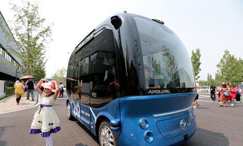 An autonomous electric bus at the Xiongan public service center in Xiongan New Area, North China's Hebei Province, on Wednesday. On January 2, China approved the overall development plan (2018-35) for the new area, a guideline to build the region with international standards and Chinese characteristics. Photo: VCG