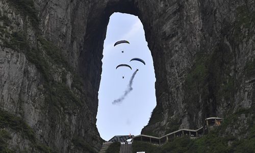 Competitors of the Paramotor Air Games fly through the Heaven’s Gate at Tianmen Mountain in Zhangjiajie City, China’s Hunan Province on June 26, 2019. Photo: VCG