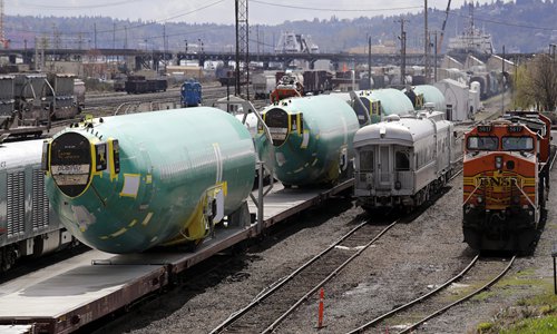 A line of Boeing 737 fuselages, eventually bound for Boeing's production facility in nearby Renton, Washington, sit on flatcar rail cars at a rail yard in Seattle on April 9. Photo: IC