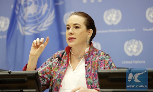 United Nations General Assembly (UNGA) President Maria Fernanda Espinosa Garces speaks to journalists during a press conference at the UN headquarters in New York, June 27, 2019. Maria Fernanda Espinosa Garces on Thursday said that her message to the leaders attending the 2019 G20 Summit was that "we have run out of time" on climate change. (Xinhua/Li Muzi)