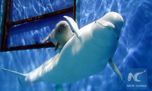 A female white whale and a calf are seen at a breeding base of Chimelong Ocean Kingdom in Zhuhai, south China's Guangdong Province, Jan. 18, 2019. Three white whale calves were born within 13 days in December 2018. (Xinhua/Liu Dawei)