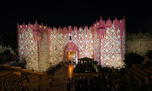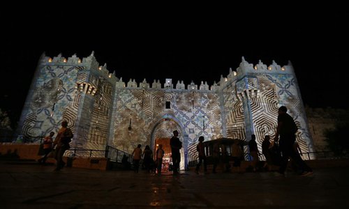 Visitors walk past the Damascus Gate during the Jerusalem Light Festival outside Jerusalem's Old City on June 27, 2019. (Xinhua/Muammar Awad)