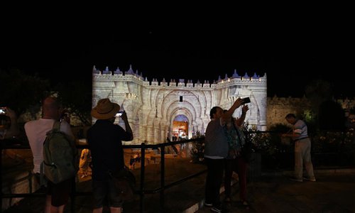 Visitors take photos of the Damascus Gate during the Jerusalem Light Festival outside Jerusalem's Old City on June 27, 2019. (Xinhua/Muammar Awad)