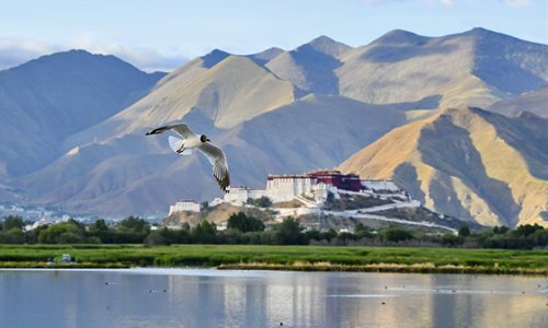 A brown-headed gull flies over Lhalu wetland in Lhasa, southwest China's Tibet Autonomous Region, June 27, 2019. Lhalu wetland national nature reserve is known as "the Lung of Lhasa". (Xinhua/Zhang Rufeng)