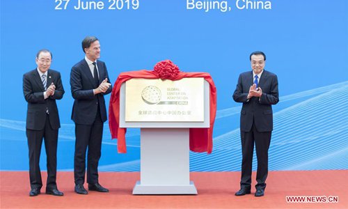 Chinese Premier Li Keqiang (R), Dutch Prime Minister Mark Rutte (C) and former UN Secretary-General Ban Ki-moon attend the inaugural ceremony of the Global Center on Adaptation China Office at the Great Hall of the People in Beijing, capital of China, June 27, 2019. (Xinhua/Wang Ye)
