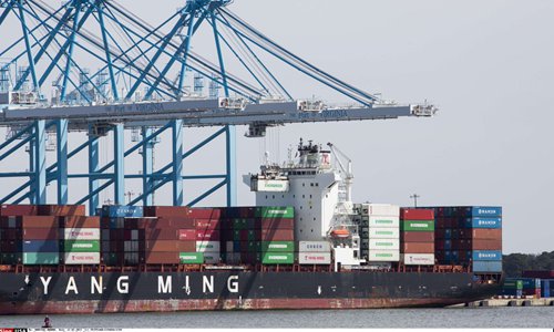 The container ship Yang Ming is loaded at the Port of Virginia in Norfolk, Virginia on March 20, 2013. (Photo by Kristoffer Tripplaar/ Sipa USA)