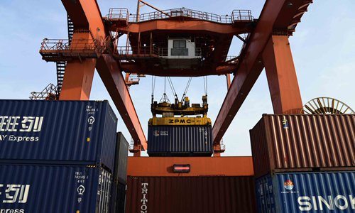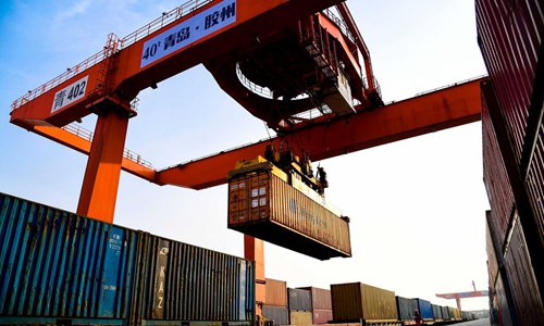 A gantry crane loads cargo onto a freight train bound for Central Asia at the Jiaozhou Bay International Logistics Harbor in Qingdao, east China's Shandong Province, May 7, 2018. (Xinhua/Guo Xulei)