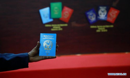 Francois Regis Gatarayiha, director general of Directorate General of Immigration and Emigration of Rwanda, introduces Rwanda East Africa e-passport in Kigali, capital city of Rwanda, on June 28, 2019. Rwanda has begun issuing the East Africa e-passport in line with the country's commitment to promote regional integration as envisioned by East African Community (EAC) partner states, an immigration official announced Friday. (Xinhua/Lyu Tianran)