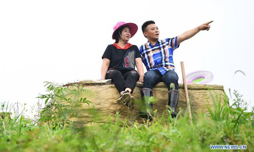 Liu Yi (L) and his wife Lu Kai take a break at a pepper planting base in Yulong Village of Nanping Township in Nanchuan District, southwest China's Chongqing, June 27, 2019. Despite losing his right arm in an accident at the age of nine, 44-year-old Liu Yi has never lowered his head towards destiny. After graduation from a vocational school in 1994, he tried a good many jobs like dishwasher, fruit dealer and coal miner. Since 2010, he has decided to start up his own business at his hometown by organizing villagers to plant bamboo roots and raising chickens. His efforts paid off. In 2016, however, Liu Yi got interested in planting peppers and since then the persistent man has opened up 1,500 mu (100 hectares) of wasteland, on which about 150,000 pepper trees are growing vigorously. Liu also sets up an example for local disabled and impoverished people, who are being employed at the planting base. "I want my two dreams accomplished-to make my hometown even greener and make my hometown even richer," said Liu Yi. (Photo: Xinhua)