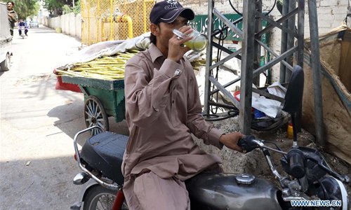 A man drinks a glass of sugar cane juice during a heatwave in Rawalpindi, Pakistan, on June 29, 2019, as temperature reached 42 degrees Celsius. (Photo: Xinhua)