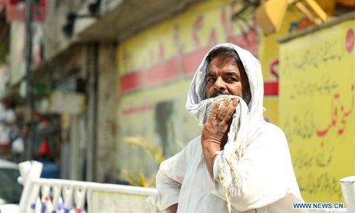 A man covers his head with a piece of cloth during a heatwave in Rawalpindi, Pakistan, on June 29, 2019, as temperature reached 42 degrees Celsius. (Photo: Xinhua)