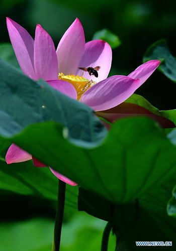 A bee flies over a lotus flower at the West Lake Park in Fuzhou, capital of southeast China's Fujian Province, June 29, 2019. (Photo: Xinhua)