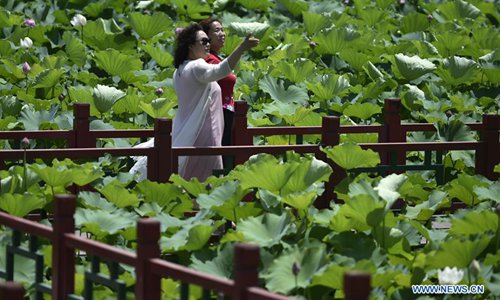 Tourists view lotus flowers at a scenic area in Xianghe County, north China's Hebei Province, June 29, 2019. (Photo: Xinhua)