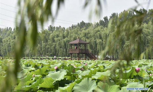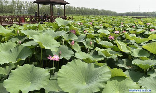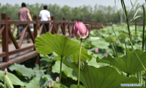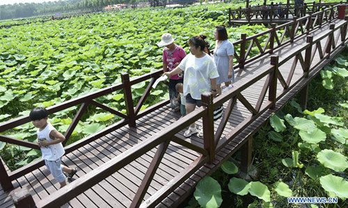 Tourists stroll on a lotus pond at Qinggongtai Village in Xianghe County, north China's Hebei Province, June 29, 2019. Lotus flowers bloom in Xianghe in summer, attracting lots of tourists. (Photo: Xinhua)