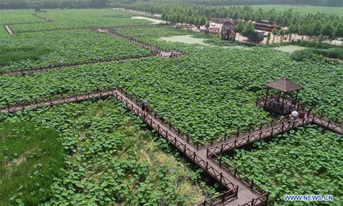 Aerial photos taken on June 29, 2019 shows tourists strolling on a lotus pond at Qinggongtai Village in Xianghe County, north China's Hebei Province. Lotus flowers bloom in Xianghe in summer, attracting lots of tourists. (Photo: Xinhua)