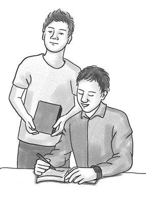 B: That painter from Xiamen? Okay, let's go. I really like his work. We can also ask for his signature and a picture together.