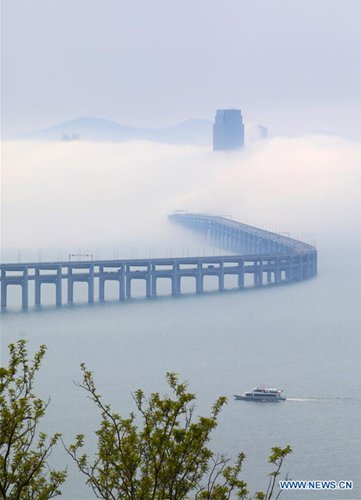 Photo taken on May 11, 2019 shows the Xinghaiwan Bridge amid advection fog in Dalian, northeast China's Liaoning Province. The 2019 Summer Davos meeting will be held from July 1-3 in northeast China's coastal city of Dalian, with globalization in the spotlight. Also known as the 13th Annual Meeting of the New Champions, this year's forum will feature the theme "Leadership 4.0: Succeeding in a New Era of Globalization." (Photo: Xinhua)